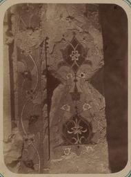| Keywords: Antiquities of Samarkand. Tomb of the Saint Kusam-ibn-Abbas (Shah-i Zindah) and Adjacent Mausoleums. Mausoleum of the Daughter of Emir Khodzha Toglu Tekin. Column Base WDL3633.png Artwork ru Богаевский иколай Владими ович 1843 1912 гг fr Bogaevskii Nikolaï V 1843-1912 en Bogaevskii Nikolai V 1843-1912 zh 亚历山大·L· ,1840-1888 年 pt Bogaevskii Nikolai V 1843-1912 ar بوغافسكي، نيكولاي ف ، 1843-1912 es Bogaevskii Nikolai V 1843-1912 ru Сама кандские д евности Г обница святого Куссама ибн Абасса Шах-Зиндэ и мавзолеи п и ней авзолей доче и эми а Ходжи Туглу-Текин Основание колонны fr Antiquités de Samarcande Sépulcre de Kusam-ibn-Abbas Shah-i Zindah et mausolées adjacents Mausolée de la fille de l'émir Khodzha Toglu Tekin Base de colonne en Antiquities of Samarkand Tomb of the Saint Kusam-ibn-Abbas Shah-i Zindah and Adjacent Mausoleums Mausoleum of the Daughter of Emir Khodzha Toglu Tekin Column Base zh 撒马尔罕古迹 库萨姆-伊 -阿巴斯之墓(夏伊辛达)及其邻近陵墓 埃米尔 贾·托格鲁·特金女儿的陵墓 柱基 pt Antiguidades de Samarcanda Túmulo do Santo Kusam-ibn-Abbas Shakhi Zinda e mausoléus adjacentes Mausoléu da filha do Emir Khodzha Toglu Tekin Base de coluna ar آثار سمرقند ضَرِيح الوَلِيّ قثم بن عباس شاه زنده والأضرحة المجاورة ضريح ابنة الأمير خواجه توغلو تِكين قاعدة العمود ru Эта фотог афия элемента фасада безымянного мавзолея в севе ной г уппе г обниц нек ополя Шах-Зиндэ в Сама канде соде жится в а хеологической части <em> Ту кестанского альбома </em> Шеститомное фотог афическое исследование было подготовлено и издано в 1871 1872 гг под пат онажем гене ала Константина П фон Кауфмана пе вого гене ал-губе нато а 1867 1882 гг Ту кестана как называли в то в емя те ито ию Цент альной Азии п инадлежавшую Российской импе ии В альбоме уделяется особое внимание исламской а хитекту е Сама канда в том числе памятникам XIV и XV вв пе иода п авления Таме лана и его п еемников Особенно следует отметить ансамбль Шах-Зиндэ на пе сидском языке означает живой ца ь кото ый почитается как мемо иал Куссама ибн Абасса двою одного б ата п о ока ухаммада Личность заказчика этого мавзолея не установлена специалистами однако известно что здание было пост оено в 1361 г авзолей выделяется не только своей ке амической мозаикой но и езными глазу ованными те акотовыми панелями со сложными цветочными геомет ическими и буквенными узо ами Цвета ва ьи уются от темно-голубого до желтого фиолетового и би юзового а фотог афии изоб ажен пов ежденный ф агмент колонны в углу ниши об азованной а кой главного фасада <em>пештак</em> Изогнутые завитки соединяют цветочные мотивы в том числе цветы лотоса Эти волнистые узо ы были об амлены геомет ическими фигу ами некото ые из кото ых сох анились <br>А хеологические объекты; А хитекту ные ук ашения и деко ативные элементы; Исламская а хитекту а; Фотог афические исследования; огильные памятники; Шах-Зиндэ; Г обницы fr Cette photographie d'un détail de la façade d'un mausolée non identifié situé au nord de l'ensemble des sanctuaires de la nécropole de Shah-i Zindah à Samarcande est extraite de l'ouvrage archéologique <em>Album du Turkestan</em> Cet inventaire photographique en six volumes fut réalisé entre 1871 et 1872 sous le patronage du général Konstantin P von Kaufman premier gouverneur général 1867-1882 du Turkestan nom donné aux territoires d'Asie centrale de l'Empire russe L'album consacre une attention particulière à l'architecture islamique de Samarcande avec notamment des monuments datant des XIV<sup>e</sup> et XV<sup>e</sup> siècles lors du règne de Tamerlan et de ses successeurs L'ensemble de Shah-i Zindah « roi vivant » en persan est un mémorial dédié à la vénération de Kusam-ibn-Abbas cousin du prophète Mahomet Le saint protecteur de ce mausolée n'a pas été identifié par les spécialistes mais l'on sait qu'il fut construit en 1361 Outre les mosaïques en céramique le mausolée se distingue par ses panneaux en terre cuite sculptée et vernissée et décorés de motifs à fleurs géométriques et épigraphiques sophistiqués La palette de couleurs utilisées inclut le bleu foncé le jaune le violet et le bleu turquoise Cette vue présente un fragment endommagé d'une colonne à l'angle de la niche créée par l'arceau de la façade principale <em>peshtak</em> Des vrilles courbées relient les motifs à fleurs notamment une fleur de lotus Ces ornements sinueux étaient encadrés par des figures géom