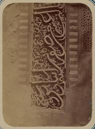 | Keywords: Antiquities of Samarkand. Tomb of the Saint Kusam-ibn-Abbas (Shah-i Zindah) and Adjacent Mausoleums. Mausoleum of Sha Arap. Section of Inscription on the Front Facade WDL3663.png Artwork ru Богаевский иколай Владими ович 1843 1912 гг fr Bogaevskii Nikolaï V 1843-1912 en Bogaevskii Nikolai V 1843-1912 zh 亚历山大·L· ,1840-1888 年 pt Bogaevskii Nikolai V 1843-1912 ar بوغافسكي، نيكولاي ف ، 1843-1912 es Bogaevskii Nikolai V 1843-1912 ru Сама кандские д евности Г обница святого Куссама ибн Абасса Шах-Зиндэ и мавзолеи п и ней авзолей Ша-А ап Часть надписи на пе еднем фасаде fr Antiquités de Samarcande Sépulcre de Kusam-ibn-Abbas Shah-i Zindah et mausolées adjacents Mausolée de Sha Arap Section d'une inscription sur la façade en Antiquities of Samarkand Tomb of the Saint Kusam-ibn-Abbas Shah-i Zindah and Adjacent Mausoleums Mausoleum of Sha Arap Section of Inscription on the Front Facade zh 撒马尔罕古迹 库萨姆-伊 -阿巴斯之墓(夏伊辛达)及其邻近陵墓 沙·阿拉普的陵墓 正立 上的部分铭文 pt Antiguidades de Samarcanda Túmulo do Santo Kusam-ibn-Abbas Shakhi Zinda e mausoléus adjacentes Mausoléu de Sha Arap Seção da inscrição na fachada frontal ar آثار سمرقند ضَرِيح الوَلِيّ قثم بن عباس شاه زنده والأضرحة المجاورة ضريح شاء آراب جزء من النقش الموجود على الواجهة الأمامية ru Эта фотог афия деко ативной надписи на безымянном мавзолее в севе ной г уппе г обниц нек ополя Шах-Зиндэ Сама канд Узбекистан соде жится в а хеологической части <em> Ту кестанского альбома </em> Шеститомное фотог афическое исследование было подготовлено и издано в 1871 1872 гг под пат онажем гене ала Константина П фон Кауфмана пе вого гене ал-губе нато а 1867 1882 гг Ту кестана как называли в то в емя те ито ию Цент альной Азии п инадлежавшую Российской импе ии В альбоме уделяется особое внимание исламской а хитекту е Сама канда в том числе памятникам XIV и XV вв пе иода п авления Тиму а Таме лана и его п еемников Особенно следует отметить Шах-Зиндэ на пе сидском языке означает живой ца ь кото ый пост оен на возвышенности бывшей местом д евнего поселения известного как Аф асиаб Шах-Зиндэ почитается как мемо иал Куссама ибн Абасса двою одного б ата п о ока ухаммада Хотя заказчик пост ойки этого мавзолея окончательно не оп еделен дата его ст оительства известна 1360 1361 гг есмот я на се ьезные пов еждения на фасаде мавзолея видно большое азнооб азие многоцветных ке амических ук ашений об азующих цветочные геомет ические и буквенные узо ы А ка фасада или <em>пештак</em> об амлена езной полосой из глазу ованной те акоты с надписью в укописном стиле сулюс Буквы вписаны в сложный узо из завитков полоса имеет бо дю из плитки а фотог афии виден ф агмент надписи в нижней левой сто оне фасада <br>А хеологические объекты; А хитекту ные ук ашения и деко ативные элементы; Исламская а хитекту а; Фотог афические исследования; огильные памятники; Шах-Зиндэ; Г обницы fr Cette photographie d'une inscription décorative d'un mausolée non identifié situé au nord de l'ensemble des sanctuaires de la nécropole de Shah-i Zindah à Samarcande est extraite de l'ouvrage archéologique <em>Album du Turkestan</em> Cet inventaire photographique en six volumes fut réalisé entre 1871 et 1872 sous le patronage du général Konstantin P von Kaufman premier gouverneur général 1867-1882 du Turkestan nom donné aux territoires d'Asie centrale de l'Empire russe L'album consacre une attention particulière à l'architecture islamique de Samarcande avec notamment des monuments datant des XIV<sup>e</sup> et XV<sup>e</sup> siècles lors du règne de Tamerlan et de ses successeurs Il convient de souligner que l'ensemble de Shah-i Zindah « roi vivant » en persan fut construit sur le site élevé d'une ancienne colonie connue sous le nom d'Afrosiabe et qu'il était dédié à la vénération de Kusam-ibn-Abbas cousin du prophète Mahomet Bien que le commanditaire du mausolée n'ait pas été identifié de façon concluante on a pu déterminer que sa construction date d'entre 1360 et 1361 Malgré les dommages considérables la façade du mausolée possède encore de riches décorations en céramique polychrome notamment des motifs floraux géométriques et épigraphiques L'arceau de façade ou <em>peshtak</em> est encadré de bandes en terre cuite sculptée et vernissée contenant une écriture en style cursif thoulouth La bande est bordée de carreaux et les lettres qu'elle contient apparaissent sur des vrilles délicates Cet