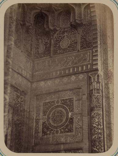 | Keywords: Antiquities of Samarkand. Tomb of Saint Kusam-ibn-Abbas (Shah-i Zindah) and Adjacent Mausoleums. Mausoleum of Emir Kutuluk Turdi Bek Aka. Detail of Niche Panel on the External Arch (Above) WDL3617.png Artwork ru Богаевский иколай Владими ович 1843 1912 гг fr Bogaevskii Nikolaï V 1843-1912 en Bogaevskii Nikolai V 1843-1912 zh 亚历山大·L· ,1840-1888 年 pt Bogaevskii Nikolai V 1843-1912 ar بوغافسكي، نيكولاي ف ، 1843-1912 es Bogaevskii Nikolai V 1843-1912 ru Сама кандские д евности Г обница святого Куссама ибн Абасса Шах-Зиндэ и мавзолеи п и ней авзолей эми а Кутулука Ту ди Бек-Ака Деталь панели ниши во внешней а ке вве ху fr Antiquités de Samarcande Sépulcre de Kusam-ibn-Abbas Shah-i Zindah et mausolées adjacents Mausolée de l'émir Kutuluk Turdi Bek Aka Détail du panneau de la niche sur l'arceau extérieur partie supérieure en Antiquities of Samarkand Tomb of Saint Kusam-ibn-Abbas Shah-i Zindah and Adjacent Mausoleums Mausoleum of Emir Kutuluk Turdi Bek Aka Detail of Niche Panel on the External Arch Above zh 撒马尔罕古迹 库萨姆-伊 -阿巴斯之墓(夏伊辛达)及其邻近陵墓 埃米尔库图卢克·吐尔迪· 克·阿卡陵墓 外部拱门上的壁龛嵌 特写(上方) pt Antiguidades de Samarcanda Túmulo do Santo Kusam-ibn-Abbas Shakhi Zinda e mausoléus adjacentes Mausoléu do Emir Kutuluk Turdi Bek Aka Detalhe do painel do nicho no arco externo acima ar آثار سمرقند ضَرِيح الوَلِيّ قثم بن عباس شاه زنده والأضرحة المجاورة ضريح الأمير كُتُلغ تُرْدِى بَكْ-أغا تفاصيل إحدى لوحات مشكاة القوس الخارجي بالأعلى ru Эта фотог афия мавзолея Шади- ульк в нек ополе Куссама ибн Абасса в Сама канде соде жится в а хеологической части <em> Ту кестанского альбома </em> Шеститомное фотог афическое исследование было подготовлено и издано в 1871 1872 гг под пат онажем гене ала Константина П фон Кауфмана пе вого гене ал-губе нато а 1867 1882 гг Ту кестана как называли в то в емя те ито ию Цент альной Азии п инадлежавшую Российской импе ии Основными составителями фотомате иалов стали п икоманди ованный к а мии востоковед Александ Людвигович Кун и военный инжене иколай Владими ович Богаевский Они уделяли особое внимание исламской а хитекту е Сама канда в том числе памятникам XIV и XV вв пе иода п авления Таме лана и его п еемников Шах-Зиндэ на пе сидском языке означает живой ца ь пост оен на месте д евнего поселения известного как Аф асиаб Комплекс почитается как мемо иал Куссама ибн Абасса двою одного б ата п о ока ухаммада авзолей Шади- ульк-Ака был пост оен в 1372 г для пог ебения Улджай Шади- ульк доче и ста шей сест ы Таме лана Кутлуг-Ту кан-Ака а снимке виден ф агмент а очной ниши главного фасада с ке амическими ук ашениями включающими многоцветную плитку майолику фаянсовую мозаику узо чатую а абскую надпись в укописном стиле сулюс езные те акотовые колонны и элемент в виде сотовой ст укту ы <em>mocárabe</em> по ве ху ниши Основными цветами являются темно-голубой и би юзовый <br>А хитекту ные ук ашения и деко ативные элементы; Исламская а хитекту а; Фотог афические исследования; огильные памятники; Шах-Зиндэ; Г обницы fr Cette photographie du mausolée de Shadi Mulk de la nécropole de Shah-i Zindah à Samarcande est extraite de l'ouvrage archéologique <em>Album du Turkestan</em> Cet inventaire photographique en six volumes fut réalisé entre 1871 et 1872 sous le patronage du général Konstantin P von Kaufman premier gouverneur général 1867-1882 du Turkestan nom donné aux territoires d'Asie centrale de l'Empire russe Les documents visuels furent essentiellement compilés par Aleksandr L Kun orientaliste rattaché à l'armée et Nikolai V Bogaevskii ingénieur militaire Ces derniers consacrèrent une attention particulière à l'architecture islamique de Samarcande avec notamment des monuments datant des XIV<sup>e</sup> et XV<sup>e</sup> siècles lors du règne de Tamerlan et de ses successeurs L'ensemble de Shah-i Zindah « roi vivant » en persan fut construit sur le site d'une ancienne colonie connue sous le nom d'Afrosiabe Il était dédié à la vénération de Kusam-ibn-Abbas cousin du prophète Mahomet Le mausolée de Shadi Mulk Aka fut bâti en 1372 pour l'enterrement d'Uldjai Shadi-Mulk fille de la sœur aînée de Tamerlan Kutlug-Turkan-Aka Cette vue présente un fragment de la niche voûtée de la façade principale dont les ornements en céramique incluent des carreaux de majolique polychromes des mosaïques de faïence une écriture arabe en style cursif thoulouth avec des motifs