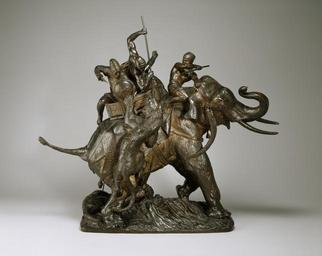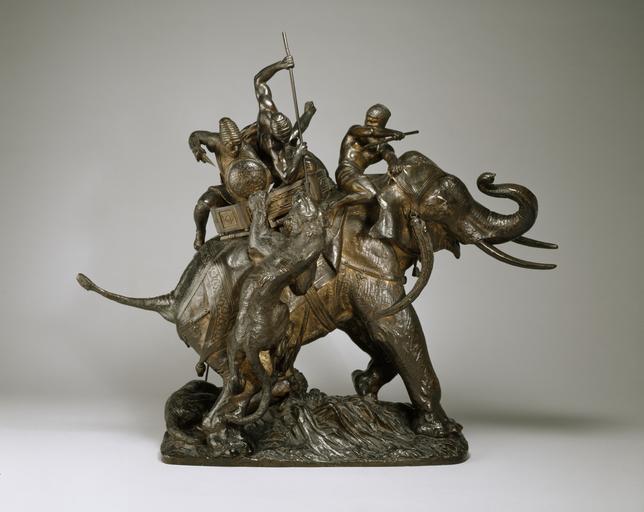 Keywords: Antoine-Louis Barye - "Surtout de table" - Tiger Hunt - Walters 27176 - Profile.jpg One can imagine this hunting scene taking place in the exotic East This sculpture originally stood on a five-foot-high gilt-bronze triumphal arch in the middle of the duke of Orléans's centerpiece Three Indians perched in the box-like howda defend themselves from a tiger clawing its way up the elephant's back The driver riding on the elephant's neck is about to strike the tiger with his barbed goad A second tiger already wounded by a spear seizes one of the elephant's rear feet Barye derived this subject from various sources including a 17th-century Persian miniature The inscription around the sculpture's base identifies the piece as having been cast by Honoré Gonon and his two sons using the more costly lost-wax process rather than sand casting Gonon was credited with reviving this technique which faithfully replicates the details of the original model between 1834 1836 bronze lost-wax cast with brown varnish patina over a metallic flake or powdered surface with details highlighted by leaf gilding cm 70 5 35 6 accession number 27 176 29585 Duc d'Orléans 1834 by commission duchesse d'Orleans Sale Paris 1853 no 1 Count Anatole Demidoff M Jaunez as agent San Donato Sale Paris March 22-24 1870 cat 1536 Philippe Burty William T Walters Baltimore February 20 1872 by purchase George A Lucas as agent Henry Walters city Baltimore Walters Art Museum Henry Walters Acquired by William T Walters 1872 BARYE 1836 BRONZE D'UN JET SANS CISELURE FONDU A L'HOTEL D'ANGEVILLIERS PAR HONORE GONON ET SES DEUX FILS Bronze cast without carving cast at the Hotel D'Angevilliers by Honoré Gonon and his two sons inscribed W / 48 technique white paint ~ number The Works of Antoine-Louis Barye American Art Gallery A Baltimorean in Paris George A Lucas 1860-1909 Un âge d'or des arts décoratifs 1814-1848 Galeries nationales du Grand Palais Paris 1991 Highlights from the Collection The Walters Art Gallery Baltimore 1998-2001 Vive la France French Treasures from the Middle Ages to Monet Untamed The Art of Antoine-Louis Barye place of origin Paris France Walters Art Museum license Sculptures by Antoine-Louis Barye Exoticism in European culture Exotic decorative artefacts Sculptures in the Walters Art Museum Tiger hunts in art Elephant goad The Works of Antoine-Louis Barye American Art Gallery A Baltimorean in Paris George A Lucas 1860-1909 Vive la France French Treasures from the Middle Ages to Monet Untamed The Art of Antoine-Louis Barye House of Demidov's collections |