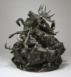 Keywords: Antoine-Louis Barye - "Surtout de table" - Elk Hunt - Walters 27175 - Profile.jpg In the duke of Orléans' table centerpiece the Elk Hunt a scene set in Mongolia was originally placed on top of a small temple-like base flanked with figurative statuettes by the sculptor Antoine Moine 1796-1849 It was placed next to the Lion Hunt at one end of the 19-foot-long centerpiece The firm of Richard et Quesnel initially tried to sand cast this sculpture but returned it to Honoré Gonon who after restoring the model cast it in separate pieces Auguste Ottin 1811-90 the sculptor who assisted Barye in the production of the Tiger Hunt helped in assembling the pieces and finishing the surface When Barye submitted this sculpture to the 1837 Salon the jury overwhelmingly rejected it between 1834 1838 bronze with heavy black varnish patina over yellow bronze with some areas of leaf gilding cm 52 1 45 7 accession number 27 175 35268 Duc d'Orléans 1834 by commission duchesse d'Orléans Sale Paris January 18-20 1853 no 1 Count Anatole Demidoff San Donato Sale Paris March 22-24 1870 no 1534 William T Walters Baltimore around November 30 1888 by purchase George A Lucas as agent Henry Walters city Baltimore Walters Art Museum Henry Walters Acquired by William T Walters ca 1888 Signature and Date Cast through from model BARYE / 1838 The Works of Antoine-Louis Barye American Art Gallery New York New York 1889-1890 Un âge d'or des arts décoratifs 1814-1848 Galeries nationales du Grand Palais Paris 1991 Highlights from the Collection The Walters Art Gallery Baltimore 1998-2001 Untamed The Art of Antoine-Louis Barye The Walters Art Museum Baltimore; Philbrook Museum of Art Tulsa; The Henry Morrison Flagler Museum Palm Beach 2007-2008 place of origin Paris France Walters Art Museum license Sculptures by Antoine-Louis Barye Media contributed by the Walters Art Museum needs category review Sculptures in the Walters Art Museum Elks in art House of Demidov's collections |