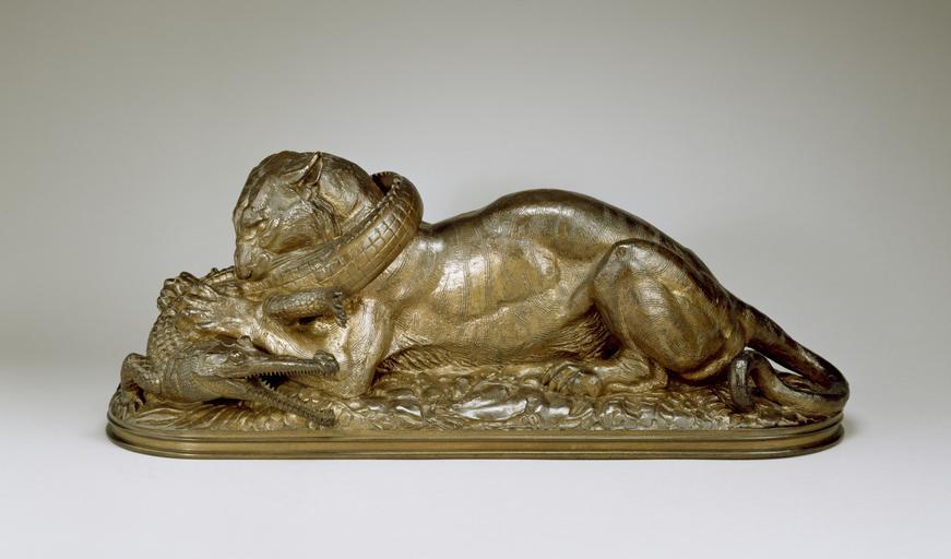 Keywords: Antoine-Louis Barye - Tiger Devouring a Gavial (First Reduction) - Walters 27154 - Profile.jpg When a plaster model for this sculpture appeared in the Paris Salon of 1831 critics were astonished by the choice of an animal theme over a more conventional human subject One critic praised the manner in which Barye expressed both the suffering of the gavial an Indian crocodile with a narrow snout and the grim determination of the tiger He also admired the sculptor's ability to portray a subject that he could never actually have witnessed This particular piece bears the stamp of A Victor Paillard 1805-1886 a Bourbon crown over the letters VP His foundry was noted for the quality of the casting There is a certain lack of clarity to the impression of the stamp which led experts to consider the possibility that the bronze was a surmoulage a cast after another cast but this opinion has now been rejected modeled ca 1831; cast ca 1845 sand cast bronze cm 20 51 3 18 4 accession number 27 154 40322 William T Walters Baltimore prior to 1889 mode of acquisition unknown Henry Walters city Baltimore Walters Art Museum 1931 by bequest Acquired by William T Walters before 1889 Signature Cast through from model BARYE; Stamp Under crown VP; Number Painted inside base in white W 20 The Works of Antoine-Louis Barye American Art Gallery New York New York 1889-1890 Untamed The Art of Antoine-Louis Barye The Walters Art Museum Baltimore; Philbrook Museum of Art Tulsa; The Henry Morrison Flagler Museum Palm Beach 2007-2008 place of origin Paris France Walters Art Museum license Tiger Devouring a Gavial by Antoine-Louis Barye Media contributed by the Walters Art Museum needs category review Sculptures in the Walters Art Museum |