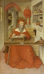 Keywords: Antonio da Fabriano II - Saint Jerome in His Study - Walters 37439.jpg Saint Jerome ca 347-420 was one of the four Latin Fathers of the Church the others being Saint Augustine Ambrose and Gregory the Great and renowned for his translation of the Bible into Latin The image of the saint in his study was popular during the 15th century especially with scholars The writing implements scrolls and manuscripts testify to Jerome's scholarly pursuits The sandglass and dying candle allude to the passage of time and remind the viewer that life is short According to legend the saint removed a thorn from the paw of a wild lion which became Jerome's companion here shown as a household pet Jerome was considered to be a cardinal of the Church and a cardinal's red hat hangs prominently on the back wall Da Fabriano's delight in realistic detail shows that the artist was one of the first in Italy to be influenced by Netherlandish painting Zeri Italian paintings in the Walters Art Gallery 125 190-191 1451 early Renaissance tempera technique oil and tooled gold panel langswitch bemalte Oberfläche Painted surface cm 88 4 52 8 ; Panel H including original engaged frame 37 13/16 x W 23 5/8 x D 1 3/16 in 96 x 60 x 3 cm accession number 37 439 27087 Don Luigi Faustini Fabriano prior to 1834 Romualdo Fornari Fabriano prior to 1866 mode of acquisition unknown Fornari family Fabriano until 1910 1907 catalogue no 6 Arnold Seligmann Rey and Co Munich and New York listed in Zeri Italian Paintings in the Walters Art Gallery I as A S Drey Henry Walters Baltimore 1911-1912 by purchase Walters Art Museum Henry Walters Acquired by Henry Walters 1911-1912 Transcription Inscribed on the piece of paper seemingly tacked to the saint's desk 1451; Inscribed on the original frame lower center ANTONIO De FABRIANO; Inscribed on the saint's halo SCVS JERONIMUS Illuminated Manuscripts Masterpieces in Miniature The Walters Art Gallery Baltimore 1984-1985 Jan van Eyck Early Netherlandish Painting and Southern Europe Groeningemuseum Brugge 2002 From Filippo Lippi to Piero della Francesca Fra Carnevale and the Making of a Renaissance Master The Metropolitan Museum of Art New York 2005 place of origin Fabriano Italy Walters Art Museum license 2D Italian Renaissance paintings in the Walters Art Museum Hourglasses in art Paintings of Saint Jerome in his study Books in art Writing in art Paintings in the Walters Art Museum Antonio da Fabriano II Red clothing in art male Writing implements |