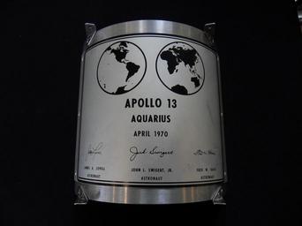 Keywords: APOLLO 13 LUNAR PLAQUE replica.jpg en Each of the Apollo Lunar Modules LM slated to land on the moon bore a curved plaque around one of its legs This is a replica of the plaque intended for the Apollo 13 LM Aquarius It was to replace the plaque already bolted to the LM which had the name of astronaut T K Mattingly He was replaced by Jack Swigert days before the mission launched Since the lunar landing was cancelled the plaque was never updated own Vybr8 2010-04-06 File A13-plaque jpg Apollo 13 |
