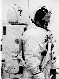 | Keywords: nasa apollo apollo 9 apollo9 astronauts space blackandwhite monochrome black and white Description: Astronaut Russell L. Schweickart, Apollo 9 prime crew lunar module pilot, participates in a Countdown Demonstration Test. He is wearing an Extravehicular Mobility Unit, or EMU. In addition to the spacesuit and bubble helmet, the EMU also includes a Remote Control Unit on his chest, a Portable Life-Support System backpack and an Oxygen Purge System. This equipment was completely independent of the spacecraft during Schweickart's spacewalk. He was secured only by a tether line. Image #: Date: Description: Astronaut Russell L. Schweickart, Apollo 9 prime crew lunar module pilot, participates in a Countdown Demonstration Test. He is wearing an Extravehicular Mobility Unit, or EMU. In addition to the spacesuit and bubble helmet, the EMU also includes a Remote Control Unit on his chest, a Portable Life-Support System backpack and an Oxygen Purge System. This equipment was completely independent of the spacecraft during Schweickart's spacewalk. He was secured only by a tether line. Image #: Date: |