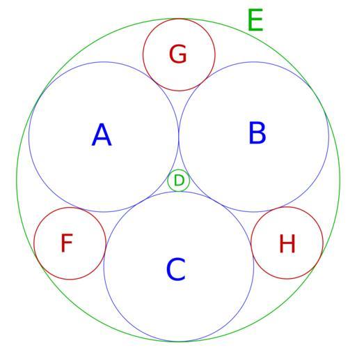 Keywords: Apollonian gasket construction.svg Construction of the Apollonian gasket We start with the three blue circles Their Apollonian circles are the two green circles If we look at the circles A B and E there are two Apollonian circles C and G Circles F and H were drawn in the same way self-made using Inkscape 2007-06-13 Stevo-88 apollonian gasket |