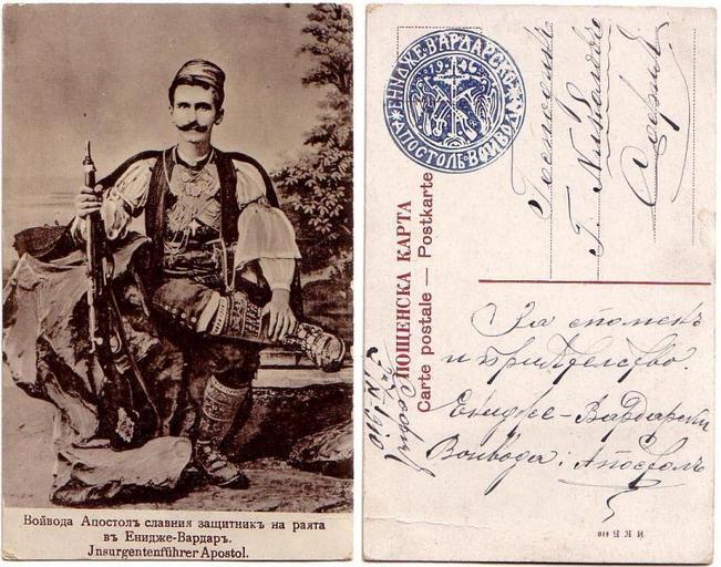 Keywords: Apostol-card.jpg Bulgarian postcard signed and stamped from Petkov and send to his fellow Tane Nicolov Ταχυδρομική κάρτα με την φωτογραφία του Α οστόλ Πετκόφ σφραγισμένη με την σφραγίδα του βοεβόδα και γραμμένη α ο τον ίδιο στον βοεβόδα Τάνε ικόλοφ Bulgarian state archive 1910 Author PD-old Apostol Petkov |