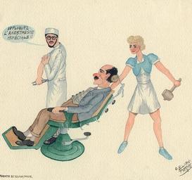 Keywords: Appliquez l’anesthésie spéciale!! (Apply the special anesthesia!!).JPG en A dentist rolls up his sleeve in preparation for tooth extraction; a patient serenely sits back in the dental chair; a nurse holding a mallet prepares to apply the mallet as anesthesia 2013-09-25 15 27 37 Courtesy of the National Library of Medicine Images from the History of Medicine IHM http //ihm nlm nih gov/images/A21903 Also showcased in the book Hidden Treasure New York NY Blast Books 2012 p 146 HMD Prints Photos call number WZ 336 E43 no 4 sol Elkan O artist Custom license marker 2013 09 25 PD-USGov Uploaded with UploadWizard Caricatures Dentistry in art Humour in art Mallets tools Nurses in art Patients in art |