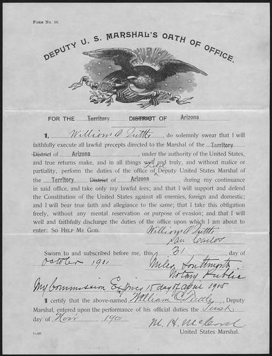 | Keywords: Appointment and Oath of Office for William O. Tuttle as Field Deputy Marshal in the Territory of Arizona. - NARA - 295880.tif Scope and content General notes 295880 Local identifier NARA's Pacific Region Riverside NRHAR 23123 Cajalco Rd Perris CA 92570 1901-11-01 Record group Record Group 527 Records of the U S Marshals Service 1864 - 1992 Record group ARC 764 Appointments and Oaths of U S Marshals and Deputy Marshals compiled 1864 - 1912 Series ARC 295651 File unit File unit ARC Variant control numbers NAIL Control Number NRHL-527-AZ1-229 yes Other versions NARA-cooperation PD-USGov Check categories-NARA 2011 September 13 Documents in English |
