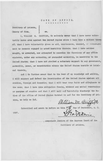 Keywords: Appointment and Oath of Office for William M. Griffith as Marshal in the Territory of Arizona. - NARA - 295734.tif Scope and content General notes 295734 Local identifier NARA's Pacific Region Riverside NRHAR 23123 Cajalco Rd Perris CA 92570 1897-09-07 Record group Record Group 527 Records of the U S Marshals Service 1864 - 1992 Record group ARC 764 Appointments and Oaths of U S Marshals and Deputy Marshals compiled 1864 - 1912 Series ARC 295651 File unit File unit ARC Variant control numbers NAIL Control Number NRHL-527-AZ1-83 yes Other versions NARA-cooperation PD-USGov Check categories-NARA 2011 September 13 Documents in English