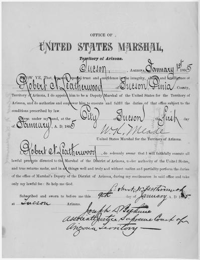 | Keywords: Appointment and Oath of Office for Robert N. Leatherwood as Deputy Marshal in the Territory of Arizona. - NARA - 295772.tif Scope and content General notes 295772 Local identifier NARA's Pacific Region Riverside NRHAR 23123 Cajalco Rd Perris CA 92570 1895-01-09 Record group Record Group 527 Records of the U S Marshals Service 1864 - 1992 Record group ARC 764 Appointments and Oaths of U S Marshals and Deputy Marshals compiled 1864 - 1912 Series ARC 295651 File unit File unit ARC Variant control numbers NAIL Control Number NRHL-527-AZ1-121 yes Other versions NARA-cooperation PD-USGov Check categories-NARA 2011 September 13 Documents in English |