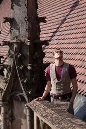 Keywords: apprentice münster ulm ulm cathedral man person craftsmen steinmetz restorer training cathedral construction hut looking up look up upward parapet trade clothing craft gothic building church city architecture roof sand stone ornaments railing stone stone works