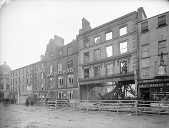 Keywords: hearne & co. hearneco hearne's hearnes ireland munster fire rubble girders burnt gormans medical hall gormansmedicalhall tylers boots tylersboots tylers boots are right every way tylersbootsarerighteveryway granville hotel granvillehotel the granville thegranville henry bell henrybell bell's chemist bellschemist chemist pharmacy prescriptions compounded prescriptionscompounded cattle medicines cattlemedicines mellins food mellinsfood monday 12th april 1915 1910s a.h. poole ahpoole poole collection poolecollection arthur henri poole arthurhenripoole glass negative glassnegative barriers ladders meagher's quay meaghersquay shops hotel fire pumps firepumps hand-powered fire pumps handpoweredfirepumps waterford national library of ireland nationallibraryofireland blackandwhite monochrome building architecture outdoor building complex black and white A row of buildings on Meagher's Quay in Waterford, pictured 10 days after a fire caused the devastation evident in this photo (the other side of Hearne's which stretched through to George's Street. We can see here that the building has been completely gutted, but as Subpopulus Hibernia points out: "It's also pretty impressive that the facade remains intact. I wonder if it was supported by a steel girder... I'm not sure how often such building techniques would have been employed in provinical Irish cities at the turn of the century." Date: Monday, 12 April 1915 NLI Ref.: P_WP_2608 A row of buildings on Meagher's Quay in Waterford, pictured 10 days after a fire caused the devastation evident in this photo (the other side of Hearne's which stretched through to George's Street. We can see here that the building has been completely gutted, but as Subpopulus Hibernia points out: "It's also pretty impressive that the facade remains intact. I wonder if it was supported by a steel girder... I'm not sure how often such building techniques would have been employed in provinical Irish cities at the turn of the century." Date: Monday, 12 April 1915 NLI Ref.: P_WP_2608 |