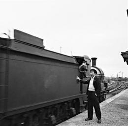 Keywords: p. mccormick pmccormick railway workers railwayworkers c.i.é cié coras iompair éireann corasiompairéireann train staff exchange staffexchange railways railroads tracks caps uniforms leixlip kildare ireland leinster platform friday 14th april 1961 1960s sixties happy man happyman steam locomotive token tablet single line singleline signalman national library of ireland nationallibraryofireland gs&wr class 101 gswrclass101 class j15 classj15 20th century 20thcentury blackandwhite monochrome outdoor black and white This photo was taken at Leixlip, Co. Kildare and shows P. McCormick and other C.I.É workers in the middle of a Staff Exchange. It's a little blurry, but that's all part of the flurry of a staff exchange, which Mr McCormick seems to be thoroughly enjoying… Decided not to attempt a technical explanation of what a staff exchange involved, because I know we have train experts on here who'd do it far better justice. Step forward blackpoolbeach who explained: "The train cannot enter a single-track section without a token. The fireman puts his arm through the hoop while on the move, or simply swaps it with the signalman. Interlocking machinery in signal boxes ensures that only one token at a time is released." He also gave this link to Wikipedia... Salmon Leap has a stunning photo of this station in the Big Freeze of 2010, and says that this station "Looks completely different nowadays, of course. The siding to the right is long since lifted, the semaphores long gone and the platform has been extended." Date: Friday, 14 April 1961 NLI Ref.: ODEA 25/12 This photo was taken at Leixlip, Co. Kildare and shows P. McCormick and other C.I.É workers in the middle of a Staff Exchange. It's a little blurry, but that's all part of the flurry of a staff exchange, which Mr McCormick seems to be thoroughly enjoying… Decided not to attempt a technical explanation of what a staff exchange involved, because I know we have train experts on here who'd do it far better justice. Step forward blackpoolbeach who explained: "The train cannot enter a single-track section without a token. The fireman puts his arm through the hoop while on the move, or simply swaps it with the signalman. Interlocking machinery in signal boxes ensures that only one token at a time is released." He also gave this link to Wikipedia... Salmon Leap has a stunning photo of this station in the Big Freeze of 2010, and says that this station "Looks completely different nowadays, of course. The siding to the right is long since lifted, the semaphores long gone and the platform has been extended." Date: Friday, 14 April 1961 NLI Ref.: ODEA 25/12 |