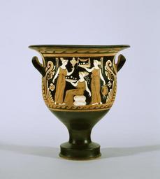 Keywords: Apulianizing Painter - Red-Figure Bell Krater with Three Women and Three Youths - Walters 482761 - Side A.jpg Here three women carry offerings a mirror and a tambourine in preparation for a ritual This scene is much more carefully executed than the one on the opposite side which shows three youths with mantles wrapped completely around their bodies Groups of two or three youths often appear on the backs of theses vases and these scenes are usually inferior to those on the front Depictions of small groups of people holding various objects are common on vases attributed to this painter who combines Apulian elements with Campanian features like the use of white to represent female skin ca 330 320 BC Hellenistic terracotta cm 39 69 37 47 ; at lip cm 37 46 diam accession number 48 2761 14868 Münzen und Medaillen A G Basel Switzerland 1983 Marilyn and Herbert Scher Pikesville MD 1983 by purchase Walters Art Museum Gift of Marilyn and Herbert Scher 2003 place of origin Campania Italy Walters Art Museum license Ancient Greek red-figure pottery in the Walters Art Museum Apulianizing Painter Media contributed by the Walters Art Museum needs category review Women in ancient Greek pottery |