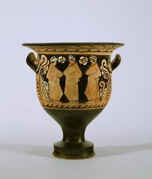 Keywords: Apulianizing Painter - Red-Figure Bell Krater with Three Women and Three Youths - Walters 482761 - Side B.jpg Here three women carry offerings a mirror and a tambourine in preparation for a ritual This scene is much more carefully executed than the one on the opposite side which shows three youths with mantles wrapped completely around their bodies Groups of two or three youths often appear on the backs of theses vases and these scenes are usually inferior to those on the front Depictions of small groups of people holding various objects are common on vases attributed to this painter who combines Apulian elements with Campanian features like the use of white to represent female skin ca 330 320 BC Hellenistic terracotta cm 39 69 37 47 ; at lip cm 37 46 diam accession number 48 2761 14868 Münzen und Medaillen A G Basel Switzerland 1983 Marilyn and Herbert Scher Pikesville MD 1983 by purchase Walters Art Museum Gift of Marilyn and Herbert Scher 2003 place of origin Campania Italy Walters Art Museum license Ancient Greek red-figure pottery in the Walters Art Museum Apulianizing Painter Media contributed by the Walters Art Museum needs category review Courtship between males who are talking |