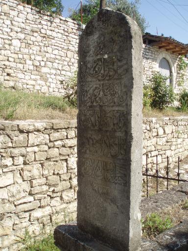 Keywords: Arabic gravestone, Berat, Albania.JPG a gravestone bearing an Arabic inscription Berati Albania Located in the court of the Han own taken by myself 2006-08 User Chlämens Berat Arabic inscriptions