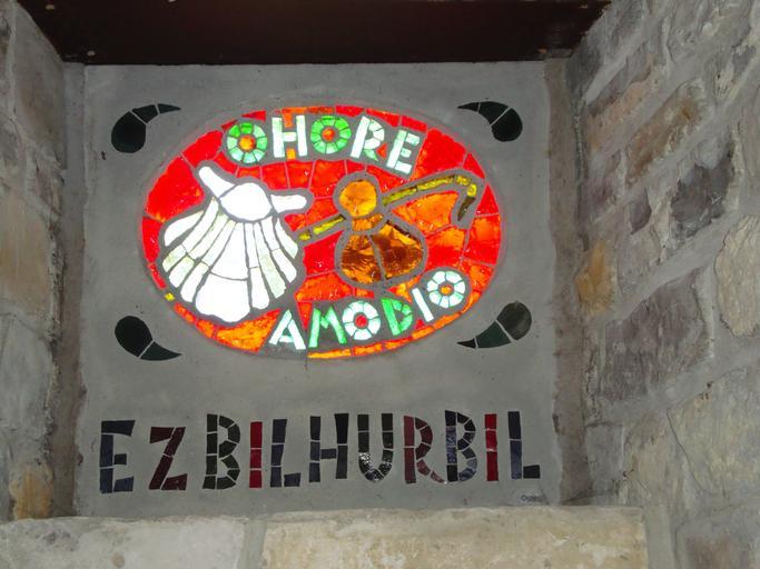 Keywords: Arbonne (Pyr-Atl., Fr) stained glass window with basque texte.JPG en Arbonne Pyr-Atl Fr small stained glass window with basque texte in the church with symbols of the St James pilgrims own Havang nl 2010-07-07 free Église Saint-Laurent d'Arbonne Stained glass windows in the Northern Basque Country Basque inscriptions in France Signs of Way of Saint James in France |
