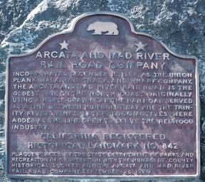 Keywords: ArcataAndMadRiverPlaque.jpg en California Registered Historical Landmark No 842 w Arcata and Mad River Railroad Plaque reads Arcata and Mad River Rail Road Company - Incorporated December 15 1854 as the Union Plank Walk Rail Track and Wharf Company the Arcata and Mad River Rail Road is the oldest line on the North Coast Originally using a horse-drawn car the railroad served as a link between Humboldt Bay and the Trinity River mines Later Locomotives were added as the line grew to serve the redwood industry California Registered Historical Landmark No 842 Plaque placed by the State Department of Parks and Recreation in cooperation with the Humboldt County Historical Society and the Arcata and Mad River Rail Road Company September 26 1970 842 original photo Ellin Beltz 2012-03-10 40 52 53 49 N 123 59 27 26 W region US California Historical Landmarks in Humboldt County California Blue Lake California Historical markers in Humboldt County California Taken with Panasonic Lumix DMC-FX12 California Historical Landmarks plaques Photographs by Ellin Beltz |