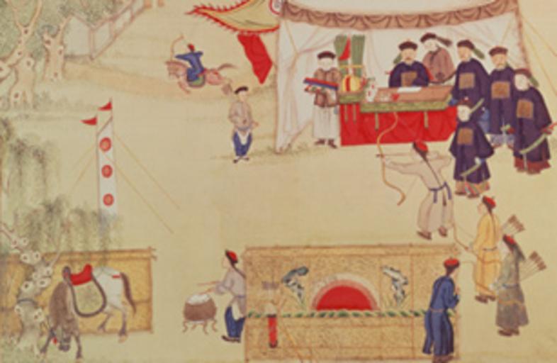 Keywords: Archery 0510.jpg A painting of the Qing Dynasty depicting an archery practice http //www time com/time/travel/article/0 31542 1985776 00 html before 1911 author PD-Old Paintings of the Qing Dynasty Martial arts of China