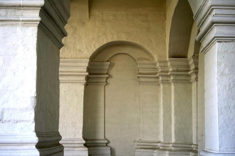 Keywords: architecture building church religion russian orthodox historic white arches pillars soft light