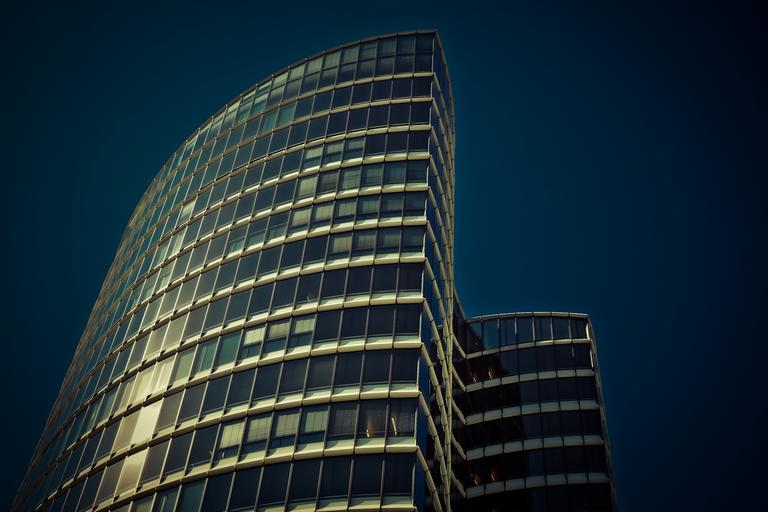 Keywords: architecture evening sun building evening lighting abendstimmung housewife high glass window dusk facade office building city skyscraper night mood blue blue hour modern düsseldorf