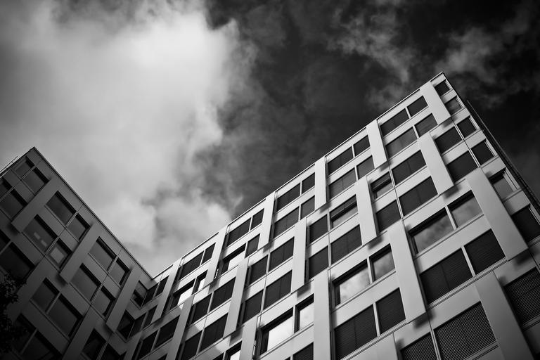 Keywords: architecture modern building facade skyscraper window big city sky düsseldorf urban city black white black and white dramatic clouds mood dramatic sky weather mood