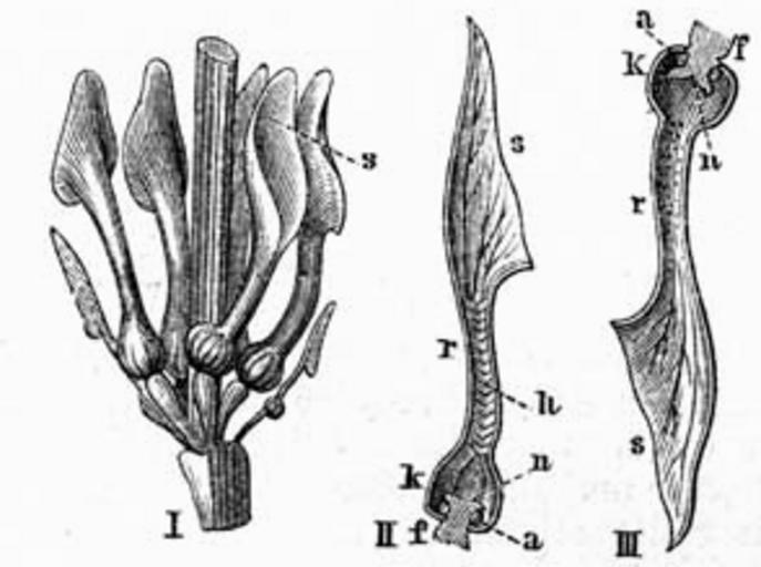 Keywords: Aristolochia clematitis meyers 1888 v3 p76.png drawing of the bloom of the European Birthwort BlĂĽtenskizze der Osterluzei I “ BlĂĽtenstand II “ BlĂĽtenstand im Längsschnitt vor der Bestäubung III “ BlĂĽtenstand im Längsschnitt nach der Bestäubung a “ Staubbeutel f “ Fruchtknoten h “ Haare k “ Kessel n “ Narbe r “ Röhre s “ Schlund Aristolochia clematitis Meyers Konversations-Lexikon 4 Aufl 1888 Bd 3 S 76 Abbildung im Text; http //susi e-technik uni-ulm de 8080/meyers/servlet/showSeite SeiteNr 0076 BandNr 3 textmode true markWords Osterluzei Osterluzei im Meyers Konversations-Lexikon Bd 3 S 76 im www / Meyers Konversations-Lexikon 4th ed 1888 vol 3 p 76 1885 Bibliographisches Institut PD-Meyers Meyers b3 s0076 jpg de Zitat aus dem Meyers Konversationslexikon 4 Aufl Band 3 Seite 76 Eine besonders merkwĂĽrdige Bestäubungseinrichtung die als Kesselfalle bezeichnet wird kommt bei den langröhrigen BlĂĽten der Osterluzei Aristolochia Clematitis vor Diese Fig 9 haben einen weiten Schlund s einen dĂĽnnen innen mit einwärts gekehrten Haaren h ausgekleideten Hals r und unten einen weiten kesselartigen Raum k in welchem direkt unter der Narbe n sich sechs Staubbeutel a befinden Die B wird hier durch winzige MĂĽckenarten bewerkstelligt die in den Kessel hineinkriechen und auf der Narbe den von frĂĽhern Besuchen mitgebrachten BlĂĽtenstaub absetzen da die Staubbeutel der BlĂĽte anfangs noch geschlossen sind Am Hinauskriechen werden sie durch die reusenartig gestellten Haare verhindert welche erst nach Ă–ffnung der Staubbeutel und gleichzeitiger Umdrehung der Blumenkrone III in Fig 9 einschrumpfen und auf diese Weise den zuerst gefangenen mit BlĂĽtenstaub beladenen Blumengästen den Austritt wieder gestatten Images from Meyers Konversationslexikon 4th edition - text figures Meyers b3 s0076 19th-century flower diagrams Diagrams with language-neutral legends |