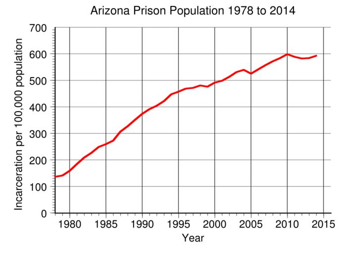 Keywords: Arizona Prison Population.svg en Arizona prison incarceration rate per 100 000 population from 1978 to 2014 Data from http //www bjs gov/index cfm ty nps BJS 2016-04-30 own Delphi234 other versions current annually Generated with Wikimedia SVG Chart SVG Chart/box cc-zero Prisons in Arizona Imprisonment and detention rates in the United States |
