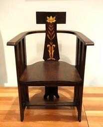 Keywords: Armchair, designed by Timothy A. Conti, made by Stickley Brothers Co., c. 1901, oak with fruitwood inlay - De Young Museum - DSC00711.JPG en Exhibit in the De Young Museum San Francisco California USA This artwork is in the public domain because it was first published in the United States before 1923 Photography was permitted in the museum without restriction 2013-11-05 15 50 03 own Daderot other versions PD-1923 cc-zero Uploaded with UploadWizard Furniture in the De Young Museum Stickley furniture |