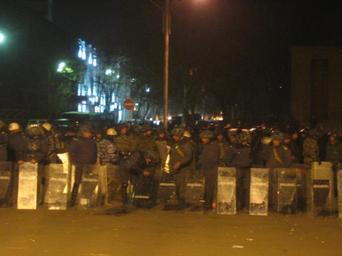 Keywords: Armenian Presidential Elections 2008 Protest Day 11 - 1205AM Shahumyan Square Police frontline closeup.jpg The 11th day of Armenian presidential election protests At 7 30 am the peaceful camp-in protest at Liberty Square in Yerevan was violently ended by Armenian special forces which used truncheons and electric shock devices to disperse the crowd of around 1 000 At 12 30 pm a new crowd marches to the French Embassy in a spontaneous demonstration barricade themselves using abandoned police buses and grow in number to around 150 000 By 12 am about 2 000 demonstrators are left barricaded <br/><br/>In this picture 12 am 2 rows of riot police followed by a row of special forces guard Shahumian Square Meanwhile tens of demonstrators which opposition leaders say are led by provocateurs loot a grocery store and break windows a kilometer away Own 2008-03-02 Serouj 40 10 33 06 N 44 30 31 18 E Demonstrations and protests relating to the Armenian presidential elections 2008 |