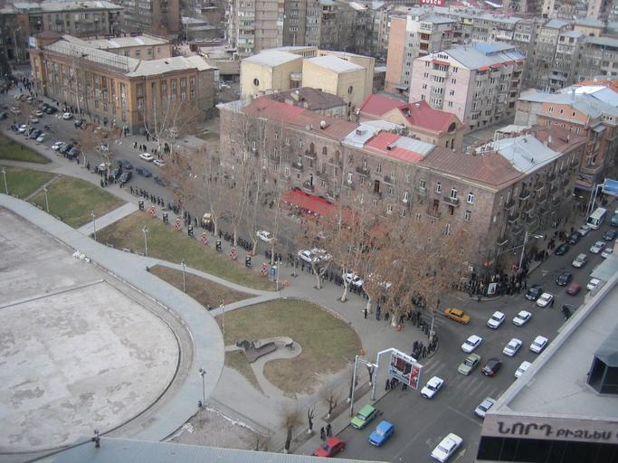 | Keywords: Armenian Presidential Elections 2008 Protest Mar 21 - Opera Square perimeter general view.jpg The first day after the 20-day state of emergency had been lifted after the Armenian presidential election protests Between 5pm and 7pm about 1 000 citizens -- mostly women -- participated in a peaceful and silent protest and vigil to remember those who died on March 1 condemn the government's actions and to recognize the more than 100 political prisoners <br/><br/>In this picture 4 51 pm a general view of the perimeter around Liberty Square Tumanyan and Deryan Ave which has been cordoned off by riot police all other major squares in Yerevan were likewise cordoned off to prevent a protest Note that photography was not allowed Own 2008-03-21 Serouj 40 11 2 61 N 44 30 53 05 E Demonstrations and protests relating to the Armenian presidential elections 2008 |
