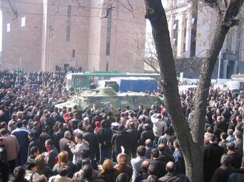 Keywords: Armenian Presidential Elections 2008 Protest Day 11 - French Embassy Demonstration 2pm people demand APC removed.jpg The 11th day of Armenian presidential election protests At 7 30 am the peaceful camp-in protest at Liberty Square in Yerevan was violently ended by Armenian special forces which used truncheons and electric shock devices to disperse the crowd of around 1 000 At 12 30 pm a new crowd marches to the French Embassy in a spontaneous demonstration In this picture 2 05pm people get increasingly vocal and begin banging the walls of the tank demanding its removal from the area Own 2008-03-01 Serouj 40 10 29 93 N 44 30 19 60 E Demonstrations and protests relating to the Armenian presidential elections 2008 |