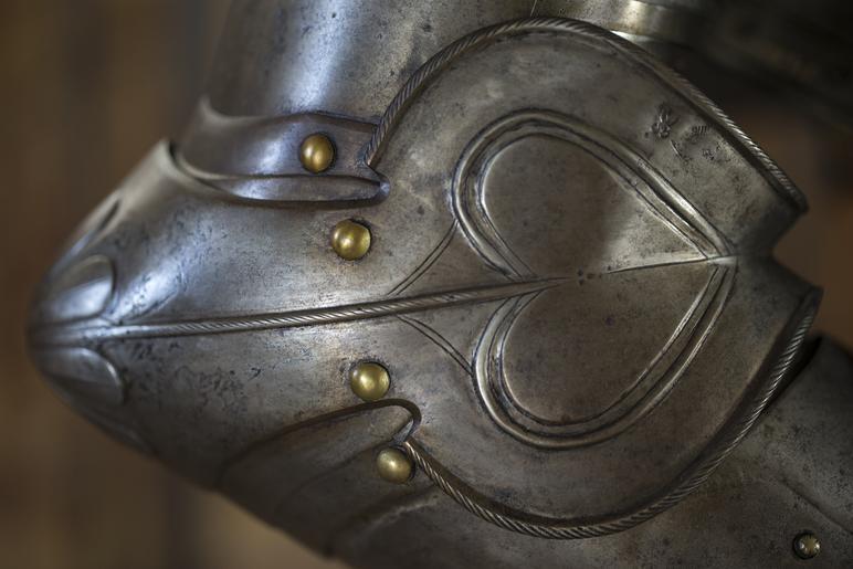 Keywords: Armskydd till rustning, 1500-talets slut - Skoklosters slott - 100607.tif LSH artwork sv Helrustning ej komplett Alla delar stämplade med Augustburgs pinjekotet och sax Enligt 1930 års katalogkort även med initialerna C S har ej kunnat upptäckas nu 1500-talets slut <br/>Bestående av 19760819 <br/>Bröstharnesk 14855 1<br/>Ryggharnesk 14855 2<br/>Ringkrage 14855 3<br/>ländskört 14855 4<br/>h axelstycke med armskydd 14855 5<br/>h handske 14855 6<br/>v axelstycke med armskydd 14855 7<br/>h lårskena med knäbuckla 14855 8<br/>v lårskena med knäbuckla 14855 9<br/>hjälm 14855 10<br/>v handske 14855 11<br/>14855 1 Bröstharnesk Låg rundad snedräfflad halshanr Dubbla graverade linjer kring hals armar och nedre kant Svagt markerad mittås Två mässingsnitar i nederkanten - för att fösta tassetterna vilka nu saknas Har troligen haft dekor av mässingsnitar utmed nederkanten Spår finnes Fastnitade läderremmar vid axlarna - att spännas vid ryggstycket <br/>H 380 mm bröstvidd 500 mm <br/>14855 2 Ryggharnesk Låg rundad snedräfflad halskant Graverade linjer på motsvarande sätt som bröstharneskets axelstycken I midjans högra sida fastnitad vit sämskad rem - spår av läderrem i vänster sida finnes <br/>H 365 mm ryggvidd 530 mm <br/>14855 3 Ringkrage med halskrage bestående av tre lameller upptill avslutad med snedräfflad kant Mässingsnitar Fodrad med vitt matlareat tyg kantat med röd sammet <br/>14855 4 Ländskört Bestående av fem lameller med mässingsnitar Påhakat vid ryggharnesket på högra sidan spärrat med hake <br/>H 180 mm b 870 mm <br/>Tillbehör Stativ nr 14866<br/>14855 5-7 11 Axelstycken med armskydd och till hörande handskar Axelstycket består av fem lameller - ryggbladen stora De sidor som går in över överarmsskyddet har tandad kant Främre nedre lamellen med mässingsros saknas på 14855 7 Axelskydd med mässingsfodrat spänne i vilket rem från ringkragen spännes Armbucklan med snidad lotusblomma Handske nr 14855 6 är komplett med stelt handledsskydd och hand-och fingerskydd T o m främre knogen bestående av lameller 14855 11 saknar de sex främre lamellerna med knogskydd 14855 11 har röd sammetskantad överkant - saknas på 14855 6 <br/>L armskydd 770 mm diam 470 mm l handske 67 mm fel mått diam 97 fel mått mm<br/>14855 8-9 Lårskenor med knäbucklor Lårskenan i två delar Den övre bestående av 4 lameller - den undre av en hel skena med knäbuckla av 8 lameller nr 14855 8 saknar nedersta delen Skarven mellan de båda delarna ornerade med räffelgraverad rund kant Dekor av graverade linjer och mässingsnitar <br/>L 520 mm b 360 mm <br/>14855 10 Hjälm visir hjälm låg mjuk rundad kant Utan hjälmkrage nertill avslutad med liten kant räffelgraverad Högra sidan med stödstång för visiret Invändigt korsade hjässremmar av sämskat skinn <br/>H 300 mm original caption Armskydd till rustning 1500-talets slut <br/> Nyckelord 1500-tal Rustning Föremålsbild Mussla Armskenor end other date century 16 size mm 1040 SKO C S place of origin original filename sm_dig15701 35687 inventory number SKO 14855 100607 CC-BY-SA Miguel Herranz <gallery caption Different images of same object > File Rustning 1500-talets slut - Skoklosters slott - 100602 tif File Rustningshandske 1500-talets slut - Skoklosters slott - 100608 tif File Rustning och nitar 1500-talets slut - Skoklosters slott - 100605 tif File Hjälmvisir 1500-talets slut - Skoklosters slott - 100603 tif File Rustning och nitar 1500-talets slut - Skoklosters slott - 100609 tif File Hjälmvisir 1500-talets slut - Skoklosters slott - 100604 tif File Rustning och nitar 1500-talets slut - Skoklosters slott - 100606 tif </gallery> Armour 16th century Miguel Herranz Media contributed by LSH unmatched keyword Media contributed by LSH 2015-11 |