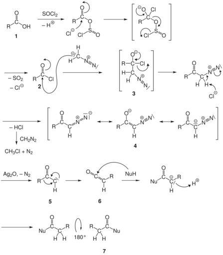 Keywords: Arndt-Eistert-Homologation mechanism V2.svg en detailed mechanism of the Arndt-Eistert-Homologation version 2 de Genauer Mechanismus der Arndt-Eistert-Homologisierung Version 2 selbst erstellt mit ChemBioOffice 11 LinuxCLP 2011-05-08 Cc-zero Arndt “Eistert reaction |