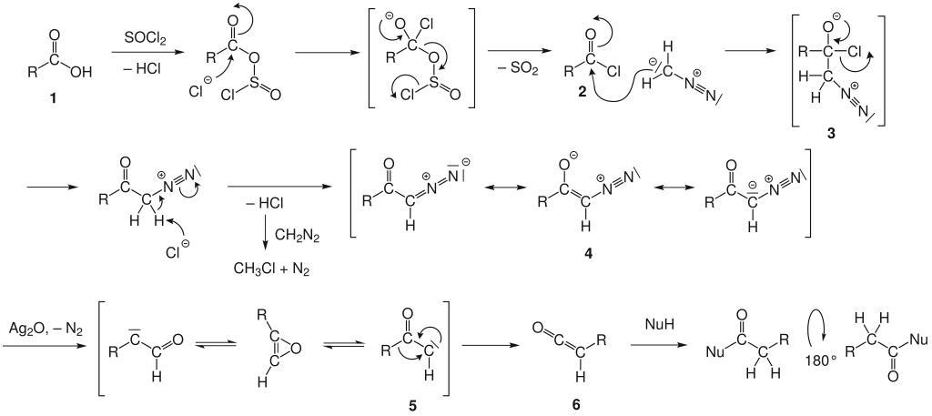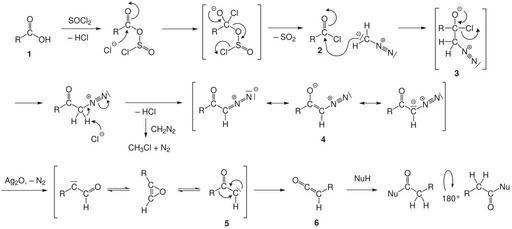 Keywords: Arndt-Eistert-Homologisierung Mechanismus.svg en detailed mechanism of the Arndt-Eistert-Homologation de Genauer Mechanismus der Arndt-Eistert-Homologisierung selbst erstellt mit ChemBioOffice 11 LinuxCLP 2011-04-28 Cc-zero Arndt “Eistert reaction |