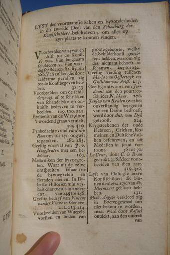 | Keywords: Arnold Houbraken VII Lyst der voornaamste zaken 1.JPG en Copy of Arnold Houbraken's Schouburg from 1719 published and sold by the author nl LYST der voornaamste zaken en byzonderheden in dit tweede Deel van den Schouhurgh der Konstschilders beschreven; om alles op zyn plaats te konnen vinden Voorbeelden van yver en drift tot de Konst 18 304 Van langzaam schilderen 8 Van vaardig schilderen 82 85 en 286 Van zulken die door zeldzame gevallen zig tot de Konst begeven hebben 32 33 Voorbeelden om de schilderjeugt af te schrikken van schandelyke en onkuisse bedryven te verbeelden 119 120 121 Beeltenis van de Wit door 't woedend graau vernielt 309 310 Fyn bedagte vond van Filip Roos om tot zyn oogwit te geraken 282 283 Geestig voorval van J v Hoog straten met een bedelaar 169 Misbruiken der byvoegzelen Waar uit de zelve ontspruiten Waar toe de byvoegzelen en cieraden dienen In Bybelse Historien min vryheid daar toe als in andere enz van 245 tot 258 Geestig bedryf van Vincent vander Vinne te Geneve 212 213 214 Voorbeelden van Waereldvorsten en luiden van groote geboorte welke de Schilderkonst geoeffent hebben; waarom zig des niemant behoeft te schamen 227 tot 232 Geestig verding tusschen Maria van Oosterwyk en Guilliam van Aelst 217 Geestig antwoord van Jordaans aan den pourtretschilder N Maas 276 Janson van Keulen over het onverstandig bejegenen van een Dame bedroeft werd door Ant van Dyk getroost 224 Krygsteekenen der oude Hebreen Grieken Romeinen en Duitsche Volken beschreven en uit Medalien in print vertoont 58 tot 70 Le Ceur door C te Brun gedrukt 318 Meer voorbeelden van dien aart 319 320 Lyst van Oulingse brave Konstschilders die binnen den levenstyd van Ab Bloemaart gebloeit hebben 131 Mich Angelo verkleed zig in Boerengewaad om niet bekend te worden maar werd door Rafael ontdekt aan den omtrek 1719 own PD-old-100 Jane023 other versions cc-0 Uploaded with UploadWizard Schouburg II |