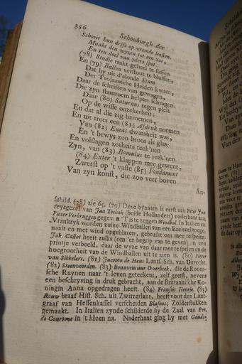 Keywords: Arnold Houbraken VII p 356.JPG en Copy of Arnold Houbraken's Schouburg from 1719 published and sold by the author nl Schoeit hun drift op vremde leesten Maakt den wyzen tot een zot En ten doel van yders spot 78 Studie raakt geheel te suffen En 79 Ballon verstout te bluffen Dat hy uit d'aloude Stam Der Trojaansche Helden kwam Daar de schriften van gewagen Die zyn stamroem helpen schragen Daar 80 Saturnus tegen pleit Op de wisse onzekerheid En dat al die zig beroemen En uit trots een 81 Afdruk noemen Van 82 Eneas dwaasheid was En 't bewys zoo broos als glas En volslagen zotheids teek'nen Zyn van 83 Romulus te reek'nen 84 Exter 't klappen meê gewent Zwetst op 't vaste 85 Fondament Van zyn Konst die zoo veer boven 78 zie 65 79 Deze bynaam is eerst aan Petit Jan reisgezel van Jan Toebak beide Hollanders naderhand aan Pieter Verbruggen gegeven 'T is te zeggen Windbal In Italien en Vrankryk worden zulke Windballen an een Ezelsvel toegenaait en met wind opgeblazen gebruikt om meê te spelen Jak Callot heeft zulks om 'er begrip van te geven in een printje verbeeld daar de wyze van daar meê te spelen en de hoegrootheid van de Windballen uit te zien is 80 Pieter van Sikkelers 81 Jacomo de Heus Lants Sch van Utrecht 82 Steenvoorden 83 Bonaventuur Overbeek die de Roomsche Ruynen naar 't leven geteekent zelf geëtst nevens een beschryving in druk gebragt aan de Brittannische Koningin Anna opgedragen heeft 84 François Henrie 85 Rouw braaf Hist Sch uit Zwitzerland heeft voor den Lantgraaf van Hessenkassel verscheiden Blafons; Zolderstukken gemaakt In Italien zynde schilderde hy de Zaal van Pet de Courtone in 't kleen na Naderhand ging hy met Goudsbloem te Hamburg wonen 2015-04-23 18 15 04 own PD-old-100 Jane023 other versions cc-0 Schouburg II Uploaded with UploadWizard Bentvueghels |
