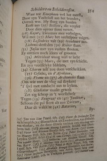 Keywords: Arnold Houbraken VII p 351.JPG en Copy of Arnold Houbraken's Schouburg from 1719 published and sold by the author nl Waar toe Kampbaan wel het meest Door zyn Vegtlust aan het branden Oorzaak was Hy sloeg zyn handen Eerst aan 25 Stilheid die verplet Door dien oproer stond verzet 26 Kaper kwanzuis meê verbolgen Wil met 27 Mars het vegtspoor volgen 28 Lossenbruy valt 29 Standaart aan Lichtmis derft den 30 Ridder slaan 31 Jason met zyn vuisten stooten Zy ontzien nog kleen of grooten 32 Mitridaat woog veel te licht Tegen 33 Mars die met zyn schicht En zyn vreesselyke blikken 34 Charon zelf zou doen verschrikken 35 Cefalus en d' Afrikaan 36 Vrome en 37 Archimedes staan Om wie met de vlag zal stryken 'T spel met aandagt aan te kyken 38 Gladiator maakt geweld Zet zig schrap in 't worstelveld Tegen 39 Ryngraaf en 40 Janitzer Schoon die pal stond als een Zwitzer Daar de wakk're 41 Batavier 25 Jan van Lint Paerd sch 26 Pieter de Zeelander Zee en Scheepsch 27 Bloemschild uit Zweden Dee van Distelbl een vloeker en die door dikwils vegten zyn een oog verloren had 28 Adriaan Honing Landsch Schild van Dort 29 Pieter van Bloemen Batalje Sch Van Antw 30 Gomarus Wouters Hist Sch van Antw 31 Jakob Torenvliet van Leiden Gezels Schil 32 N van Haringe 33 -zie 27 34 Jan vander Hooge 35 Nolbertus van Bloemen Gezels Sch van Antw 36 F Matheus van Antw 37 Abraham Genoels Lands Sch van Antw 38 Jakob de Baan Pourt Sch van 's Gravenhagen 39 Abraham Breugel Bloemsch van Antw 40 Pieter Hofmans Bataljesch van Antw heeft lang met Zantruiter Lands Sch in Turkyen geweest 41 Samuel van Hoogstraten Hist Sch van Dordr 2015-04-23 17 44 49 own PD-old-100 Jane023 other versions cc-0 Schouburg II Uploaded with UploadWizard Bentvueghels |