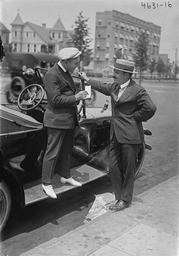Keywords: ArthurFieldsRunningboardAuthograph.jpg U S singer and Vaudeville star Arthur Fields at left stands on automobile running board talking to unidentified man with moustache and straw boater hat Bain News Service photo via Library of Congress website at http //hdl loc gov/loc pnp/ggbain 27163 Converted from TIFF to jpg and edges cropped before upload Not dated c 1920s Uncredited photographer for Bain News Service PD-Bain Arthur Fields Standing men 1920s fashion Flat caps Straw boaters unidentified automobiles People with automobiles |