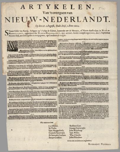 Keywords: Articles about the Transfer of New Netherland on the 27th of August, Old Style, Anno 1664 WDL4062.png Artwork ru Статьи о пе едаче овых иде ландов 27 августа по ста ому стилю в 1664 году от Рождества Х истова fr Articles à propos du transfert de la Nouvelle-Néerlande le 27 août Old Style Anno 1664 en Articles about the Transfer of New Netherland on the 27th of August Old Style Anno 1664 zh 关于8 27日移交新荷兰的 款,旧式,伊斯兰教纪元1664年 pt Artigos sobre a Transferência de Nova Holanda no dia 27 de agosto Old Style Calendário Antigo Ano 1664 ar مواد حول انتقال نيو نذرلند في 27 آب، في النمط القديم، سنة 1664 ru 27 августа 1664 года флотилия из четы ех б итанских военных судов под командованием полковника Рича да иколлса вошла в бухту ового Амсте дама ныне г ью-Йо к и пот ебовала от гене ал-губе нато а Пите а Стёйвесанта сдачи колонии овые иде ланды англичанам Поскольку по численности воо уженных солдат англичане значительно п евосходили голландцев Стёйвесант был вынужден подчиниться этому т ебованию иколлс стал пе вым губе нато ом пе еименованной п овинции ью-Йо к В данном документе пе ечисляются статьи капитуляции и пе едачи колонии англичанам а также устанавливаются п ава голландских поселенцев п овинции под уп авлением Великоб итании В 24 статьях п иводятся положения га анти овавшие оп еделенные неотъемлемые п ава в том числе п аво на свободу совести в отношении п оведения богослужений и це ковной дисциплины п аво на владение имуществом и п аво голландцев следовать своим национальным т адициям в отношении воп осов наследования Захват овых иде ландов англичанами послужил п ичиной Вто ой англо-голландской войны в 1665-1667 годах; лишь в Вестминсте ском ми ном догово е 1674 года п авительство иде ландов официально п изнало пе едачу те ито ии колонии во владение Англии <br>Колониальная Аме ика; Великоб итания Колонии; иде ланды - Колонии; овые иде ланды; ью-Йо к Колония ; Политика и уп авление fr Le 27 août 1664 une flotte de quatre navires de guerre britanniques sous le commandement du colonel Richard Nicolls entra dans le port de la Nouvelle-Amsterdam aujourd'hui New York et exigea de Peter Stuyvesant directeur général de la colonie hollandaise de Nouvelle-Néerlande la remise de la colonie aux Britanniques Stuyvesant battu n'eut d'autre choix que d'obtempérer et sous la domination anglaise Nicolls devint le premier gouverneur de la province renommée de New York Ce document énonce les articles de la capitulation selon lesquels la colonie fut cédée et qui établirent les droits des colons hollandais sous la domination anglaise Parmi les 24 articles se trouvent des dispositions qui garantissaient certains droits permanents notamment la liberté de conscience dans le culte divin et la morale religieuse la possession de droits de propriété et le droit des Hollandais de suivre leurs propres coutumes en matière de succession La capture anglaise de la Nouvelle-Néerlande fut l'une des raisons pour lesquelles la Deuxième guerre anglo-hollandaise de 1665-67 eut lieu et il fallut attendre le traité de Westminster en 1674 pour que le gouvernement des Pays-Bas reconnaisse officiellement le transfert de la colonie aux Anglais <br>Amérique coloniale; Grande-Bretagne--Colonies; Pays-Bas--Colonies; Nouvelle-Néerlande; New York colonie ; Politique et gouvernement en On August 27 1664 a fleet of four British warships under the command of Colonel Richard Nicolls sailed into the harbor of New Amsterdam present-day New York City and demanded that Peter Stuyvesant the director-general of the Dutch colony of New Netherland surrender the colony to the British The out-gunned Stuyvesant had no choice but to comply and under English rule Nicolls became the first governor of the renamed Province of New York This document lists the articles of capitulation by which the colony was surrendered and that established the rights of Dutch settlers under English rule Among the 24 articles were provisions that guaranteed certain permanent rights including liberty of conscience in divine worship and church discipline the possession of property rights and the right of the Dutch to follow their own customs with regard to inheritance The English seizure of New Netherland was one of the reasons why the Second Anglo-Dutch War of 1665 67 occurred and it was not until the Treaty of Westminster in 1674 that the government of the Netherlands formally acknowledged the transfer of the colony to the English <br>Colonial America; Great Britain--Colonies; Netherlands--Colonies; New Netherland; New York Colony ; Politics and government zh 1664年8 27日,由理查德·尼科斯上校率领的包含四艘军舰的英国舰队驶入新阿姆斯特丹(今纽约市),要求新荷兰的荷兰殖民 干事彼得·斯泰弗森特将这 殖民 移交给