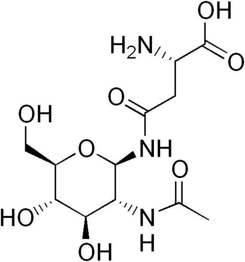 Keywords: Aspartylglucosamine.png chemical structure of aspartylglucosamine Own 19 51 5 June 2008 UTC Edgar181 Amino sugars Glycosides
