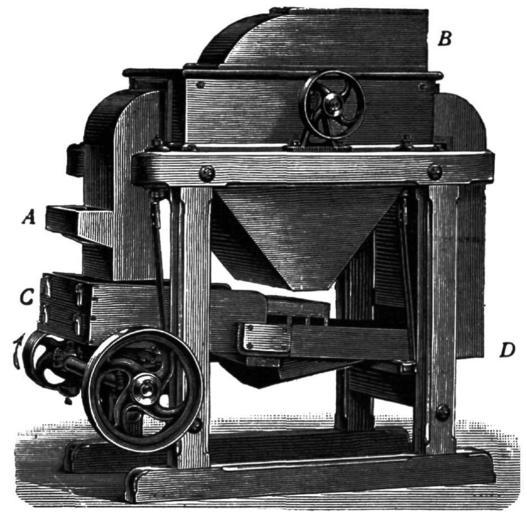 Keywords: Aspirationsreinigungsmaschine.png de Original Aspirationsreinigungsmaschine von G Luther Braunschweig Aspirationsreinigungsmaschine eine Getreidereinigungsmaschine welche die Körner nicht nur durch eine Reihe von Sieben sondern auch durch einen saugenden Luftstrom Aspiration reinigt die also eine Vereinigung von Schüttelsieben323 mit einem Tarar vgl a Reinigungsmaschine darstellt Meistens kommt der Luftstrom mehrere Male zur Anwendung Die nebenstehende Figur zeigt ein Beispiel Bei A findet der Einlauf des Getreides statt Das aufsteigende Rohr wird von einem durch den Exhaustor B erzeugten Luftstrom durchflossen wodurch also das Getreide gleich beim Einfall aspiriert wird Die Körner gelangen dann in den in Rüttelbewegung befindlichen mit dem Siebsystem versehenen Kasten C in dem Sand und seine Unreinigkeiten einerseits und größere Steine Erdschollen u s w anderseits abgesondert werden An der Ausfallstelle D endlich bewirkt das ebenfalls zum Exhaustor führende senkrechte Rohr eine nochmalige Aspiration Der große trichterförmige Behälter in der Mitte der Maschine der Separator dient zur Ablagerung der vom Exhaustor mitgerissenen leichten Unreinigkeiten während der ganz seine Staub in eine besonders anzulegende Staubkammer geblasen wird Größere Maschinen weisen eine größere Gruppe von untereinander liegenden nach unten immer seiner werdenden Sieben auf durch deren obere das Getreide hindurchfällt während das unterste nur Sand und Staub durchtreten das Getreide aber seitlich ablaufen läßt In neuerer Zeit ordnet man auf der unteren Seite des untersten Siebes das sich leicht zusetzt eine hin und her gehende Reinigungsbürste an Lueger Otto Lexikon der gesamten Technik und ihrer Hilfswissenschaften Bd 1 / http //www zeno org/Lueger-1904/A/Aspirationsreinigungsmaschine+ 5B1 5D zeno org author <1904 Dieses Werk ist nach unserer Meinung frei von Rechten Dritter Vor einer weiteren Verwertung ist unbedingt zu überprüfen ob diese Auffassung haltbar ist da Zenodot jegliche Haftung ablehnt und ausdrücklich nicht von möglichen Ansprüchen Dritter freistellt Für den Fall einer Bestätigung unserer Auffassung gilt Dieser Inhalt darf als Einzelwerk oder Werkbestandteil - auch zu kommerziellen und gewerblichen Zwecken - kopiert verbreitet öffentlich wiedergegeben und Dritten zugänglich gemacht werden Wir bitten darum auf die Herkunft des Inhaltes wie folgt hinzuweisen Quelle http //www zeno org - Zenodot Verlagsgesellschaft mbH Copyright-Vermerke Marken oder andere Rechtsvorbehalte Dritter dürfen nicht entfernt werden According to our opinion this work is free of third party rights Before any further utilisation it is imperative to examine whether this assessment can be maintained as Zenodot refuses any liability and does expressly not indemnify from potential claims by third parties In case of a confirmation of our assessment the following shall apply These contents may be copied disseminated publicly reproduced and be made available to third parties as an individual work or as part of a work - also for business or commercial purposes We ask you to refer to the origin of such contents as follows Source http //www zeno org - Zenodot Verlagsgesellschaft mbH Copyright notes trademarks or other reservations of rights by third parties may not be deleted Cereals PD-old Images from zeno org Luther-Werke |