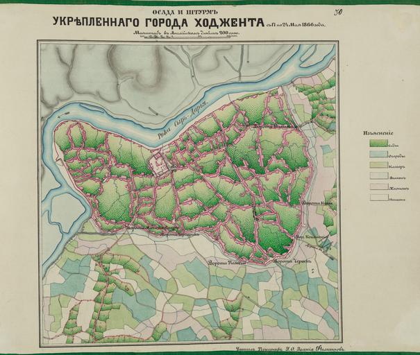 | Keywords: Assault and Seige of the Fortified City of Khodzhend from May 17 to 24, 1866- Drawn by the Topographer NCO Filippov WDL598.png Artwork ru Филиппов Се жант fr Filippov Sous-officier en Filippov NCO zh 菲利波夫 NCO pt Filippov NCO ar فيليبوف ضابط الصف es Filippov NCO ru Шту м и осада ук епленного го ода Ходжента с 17 по 24 мая 1866 года Рисунок сделан топог афом се жантского состава Филипповым fr Assaut et siège de la ville fortifiée de Khodzhend du 17 au 24 Mai 1866 Tracé par le sous-officier topographe Filippov en Assault and Seige of the Fortified City of Khodzhend from May 17 to 24 1866 Drawn by the Topographer NCO Filippov zh 1866年5 17-24日苦盏防卫城的袭击与围攻 由 形学 NCO·菲利波夫绘制 pt Assalto e Cerco da cidade fortificada de Khodzhend de 17 a 24 de maio de 1866 Desenhado pelo topógrafo NCO Filippov ar الهجوم والحصار على مدينة خودجند المحصنة من 17 إلى 24 أيار / مايو، 1866 رسم ضابط الصف الطوبوغرافي فيليبوف ru Ка та го ода Ходжент на таджикском языке Худжанд во в емя его осады усскими 17-24 мая 1866 года входит в <i> Ту кестанский альбом </i>один из самых богатых источников наглядной инфо мации о культу ных памятниках С едней Азии в том виде как они существовали в XIX веке ноготомное издание было выпущено в 1871-1872 годах под пат онажем Константина П фон Кауфмана гене ала усской а мии кото ый был пе вым гене ал-губе нато ом Ту кестана в составе Российской импе ии Кауфман оставался гене ал-губе нато ом с 1867 по 1886 год и сыг ал значительную оль в деле ук епления домини ующей позиции России в Цент альной Азии Вслед за военными в ст ану п ибыли чиновники и п едп иниматели а также ученые заинте есованные в сбо е документальных свидетельств богатейшего культу ного исламского наследия егиона С еди главных фотог афов-составителей <i> Ту кестанского альбома </i> были Александ Л Кун 1840-1888 ученый-востоковед в составе усской а мии и иколай В Богаевский 1843-1912 военный инжене а данной ка те составленной на основе наб оска топог афа унте -офице а Филиппова под обно от ажено объемно-плани овочное ешение этого исто ического го ода на еке Сы да ья в частности асположение цитадели относительно ок ужающих ее ст оений а также стены и главные во ота го ода а ка те также азными цветами обозначены сады ого одные участки пастбища и хлопковые поля <br>Походы и с ажения; Топог афические ка ты fr Cette carte représentant la ville de Khodzhent Khujand en tadjik au moment du siège russe entre les 17 et 24 mai 1866 figure dans le <i>Turkestan Album</i> l'une des sources les plus riches d'information visuelle sur les monuments culturels d'Asie centrale au 19ème siècle Cette édition comprenant plusieurs volumes a été réalisée en 1871-72 sous le patronage de P Konstantin von Kaufman général de l'armée russe sous l'empire et premier gouverneur général du Turkestan En poste de 1867 à 1886 Kaufman a joué un rôle majeur dans le renforcement des positions russes en Asie centrale Les forces de conquête ont en effet été suivies par des administrateurs et des entrepreneurs aussi bien que par des chercheurs intéressés par le remarquable patrimoine culturel islamique de la région Les premiers à avoir travaillé sur le <i>Turkestan Album</i> étaient Aleksandr L Kun 1840-88 un orientaliste appartenant à l'armée et Nikolai V Bogaevskii 1843-1912 un ingénieur militaire Cette carte réalisée d'après le dessin d'un topographe non commissionné connu sous le nom de Fillipov fournit de précieux détails sur l'organisation spatiale de cette ville historique située près du fleuve Syr-Daria notamment sur le lien de sa citadelle avec les structures environnantes ainsi que sur le mur et les portes entourant la ville D'autres éléments figurent sous différentes couleurs les jardins les potagers les pâturages et les champs de coton <br>Campagnes et batailles; Cartes topographiques en This map of the city of Khodzhent Khujand in Tajik at the time of the Russian siege of May 17-24 1866 is contained in <em>Turkestan Album</em> one of the richest sources of visual information on the cultural monuments of Central Asia as they appeared in the 19th century The multi-volume edition was produced in 1871-72 under the patronage of Konstantin P von Kaufman a Russian army general and the empire's first governor-general of Turkestan Kaufman held that position from 1867 to 1886 during which time he played a major role in establishing Russia's dominant position in Central Asia The forces of conquest were followed by administrators and entrepreneurs as well as scholars interested in documenting the region's remarkable Islamic cultural heritage The primary photographic compilers for the <em>Turkestan Album</em> wer