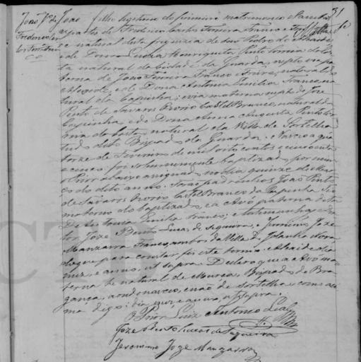 | Keywords: Assento de baptismo, João Franco (15 Mar. 1855).png en Baptism register at the time the equivalent of a birth record of João Franco 1855-1929 dated 15 March 1855 Alcaide Parish Fundão en Assento de baptismo à altura equivalente a certidão de nascimento de João Franco 1855-1929 datado de 15 de Março de 1855 Paróquia de Alcaide Fundão 1855-03-15 http //digitarq adctb arquivos pt/viewer id 1040919 Arquivo Nacional Torre do Tombo - Livro de Registo de Baptismos 1851/1859 Paróquia de Alcaide author other versions PD-old-70-1923 Uploaded with UploadWizard João Franco 1855 documents Documents in Portuguese Baptism registers Baptism in Portugal ImageNote 1 156 19 813 1014 1035 1037 2 João filho legitimo do primeiro matrimonio d'ambas as partes de Frederico Carlos Ferreira Franco e Freire natural desta freguezia de São Pedro do Alcaide e de Dona Luiza Henriqueta Pinto Correia da Costa natural da Cidade da Guarda nepto via paterna de João Ferreira Franco e Freire natural do Alcaide e de Dona Antonia Emilia Franco natural da Capinha; e via materna nepto de Joze Pinto de Tavares Castel'Branco natural da C e de Dona Anna Augusta Pinto Correia da Costa natural da Villa de Sortelha tudo diste Bispado da Guarda; e nasceo a quatorze de Fevereiro de mil oito centos e cincoenta e cinco foi solemnemente baptizado por mim o Prior abaixo assignado no dia quinze de Março do dito anno Forão padrinhos João Pinto de Tavares Castel'Branco da C tio materno do baptizado e a Avó paterna d'este D Antonia Emilia Franco e testemunhas Joze Bento Lucas de Sequeira e Jeronimo Joze Manzarra Franco ambos da Villa de Idanha Nova do que para constar fis este termo Alcaide dia mez e anno ut supra Declaro que a Avó materna he natural de Murça Bispado de Bragança aonde nasceo e não de Sortelha como acima digo dia mez e anno ut supra <br/>O Prior Luiz Antonio Leal<br/>Joze Bento Lucas de Sequeira<br/>Jeronimo Joze de Manzarra ---- João legitimate son of the first matrimony of both Frederico Carlos Ferreira Franco e Freire from this parish of São Pedro do Alcaide and D Luiza Henriqueta Pinto Correia da Costa from the City of Guarda a grandson on his father's side of João Ferreira Franco e Freire from Alcaide and of D Antonia Emilia Franco from Capinha; and on his mother's side of Joze Pinto de Tavares Castel'Branco from C and of D Anna Augusta Pinto Correia da Costa from the Town of Sortelha all in this Bishopric of Guarda; and born on the fourteenth of February eighteen fifty-five was baptised by me the undersigned Priest on the fifteenth of March of the same year The godparents were João Pinto de Tavares Castel'Branco da C maternal uncle of the child and the child's paternal grandmother D Antonia Emilia Franco as witnessed by Joze Bento Lucas de Sequeira e Jeronimo Joze Manzarra Franco both from the Town of Idanha-a-Nova based on which I drew up this register for the record Alcaide on the day month and year ut supra I declare that the paternal Grandmother is from Murça Bishopric of Bragança where she was born and not from Sortelha as written above day month and year ut supra <br/>The Priest Luiz Antonio Leal<br/>Joze Bento Lucas de Sequeira<br/>Jeronimo Joze de Manzarra ImageNoteEnd 1 |