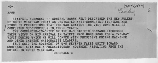 MAKE A MEME View Large Image Associated Press Wire Report on Statement by Admiral Felt - NARA - 193705.tif Scope and content Associated Press report on statement by Admiral Harry Felt concerning the new rulers in Vietnam General notes 193705 Local identifier President ...