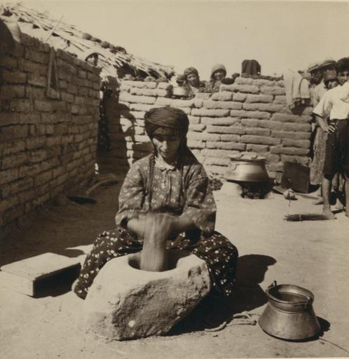 Keywords: Assyrian woman pounding Burghul.jpg en Assyrian refugees at Tell-Tamar and the Khabour River July 21 Something of the twenty-seven villages built here by the League of Nations Pounding burgul with a stone pestal LC-DIG-ppmsca-17416-00120 digital file from original on page 64 no 2094A 1939 http //www loc gov/pictures/item/2007675290/ Diary in photos vol V 1939 Library of the Congress Whiting John D John David 1882-1951 PD-Matson Uploaded with UploadWizard Assyrians of Khabur John D Whiting Matson Collection Pounding grain Burgul برغل |