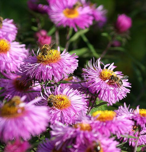 Keywords: astra bees flowers autumn insects nature pollination flourishing sharpness the bees at work clear violet pink garden closeup the petals the stems