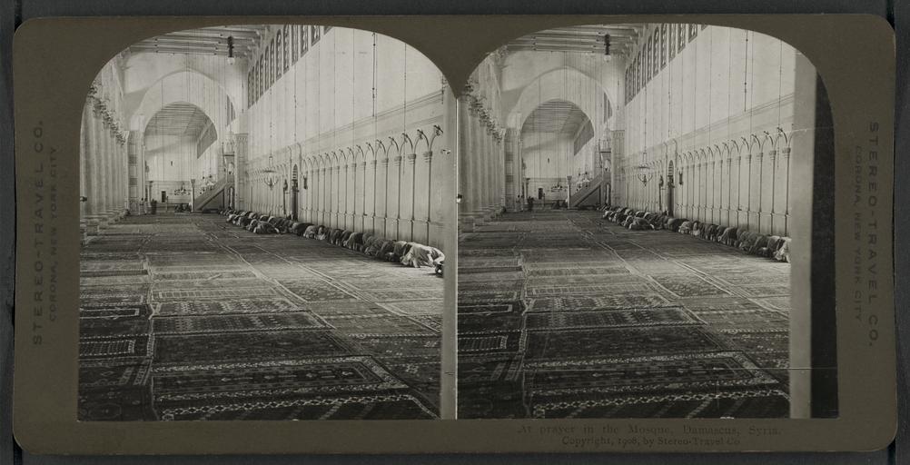 | Keywords: At Prayer in the Mosque, Damascus, Syria WDL2519.png Artwork ru В олитва в мечети Дамаск Си ия fr A La prière dans la mosquée Damas Syrie en At Prayer in the Mosque Damascus Syria zh 清 寺的祈祷,大马士 ,叙利亚 pt A Oração na Mesquita Damasco Síria ar في الصلاة في المسجد، دمشق، سوريا ru а этом снимке дати ованном 1908 годом изоб ажены мужчины-мусульмане во в емя молитвы в Великой мечети Умайад в Дамаске Джами эль-Умави аль-Каби Эта мечеть пост оенная в VIII веке на месте более анних х амов является духовно значимым местом как для мусульман суннитов так и для шиитов Также считается что в этой мечети х анится голова Иоанна К естителя Этот снимок является сте еоснимком сделанным компанией Сте ео Т эвел Кампани из го ода Ко она Лонг-Айленд штат ью-Йо к эта небольшая фи ма вела активную деятельность в началеXX века Отк ытки со сте еоизоб ажением эффект глубины на кото ых создавался благода я наложению двух плоских изоб ажений были в то в емя ч езвычайно популя ны с еди ту истов Две фотог афии азмещаются ядом д уг с д угом и п осмат иваются че ез п ибо кото ый называется сте еоскоп Каждый глаз фокуси уется на одном изоб ажении благода я чему создается иллюзия т ехме ности изоб ажения <br> ужчины; ечети; усульмане; Восточные ков ы; олитва; Духовная жизнь fr Cette carte de 1908 représente des hommes musulmans en prière dans la Grande Mosquée des Omeyyades de Damas Jami 'al-Umawī al-Kabir Construite au huitième siècle sur l'emplacement des anciens lieux de culte la mosquée est un site d'importance spirituelle pour les musulmans sunnites et chiites Elle abriterait également la tête de Jean le Baptiste La carte est une stéréoscopique produite par la société Stereo Voyage de Corona Long Island New York entreprise active au début du 20ème siècle Populaire auprès des touristes à l'époque ces cartes stéréoscopiques donnaient l'illusion de la profondeur grâce à la juxtaposition de deux images plates Deux photographies sont placées côte à côte et visualisées par le biais d'un instrument appelé stéréoscope Chaque œil se concentre sur une image créant une sensation tri-dimensionnelle <br>Hommes; Mosquées; Musulmans; Tapis d'Orient; Prière; Vie spirituelle en This card from around 1908 depicts Muslim men at prayer in the Great Umayyad Mosque of Damascus Jāmi' al-Umawī al-Kabīr Constructed in the eighth century on the site of earlier places of worship the mosque is a site of spiritual significance to both Sunni and Shi a Muslims It is also said to house the head of John the Baptist The card is a stereo view produced by the Stereo Travel Company of Corona Long Island New York which was active in the early years of the 20th century Popular with tourists at the time stereo cards create the illusion of depth through the juxtaposition of two flat images Two photographs are placed side-by-side and viewed through an instrument called a stereoscope Each eye focuses on one image creating a sense of three-dimensionality <br>Men; Mosques; Muslims; Oriental rugs; Prayer; Spiritual life zh 这张大约拍摄于 1908 年的卡片描绘的是穆斯林男子 大马士 的奥马亚清 寺(Jāmi' al-Umawī al-Kabīr)祈祷的情形 该清 寺于八世纪 前礼 点修建,是 尼派和 叶派穆斯林的精神家园 据说还藏 施洗礼 约翰的头 该卡片是 幅立体画,由纽约长岛的科罗 立体旅游公司制 ,该公司 20 世纪早 十分活跃 这种立体卡片深受当时的旅行 的 爱,可 过两个平 图像的并置创 出立体的幻觉 两张照片并排放置,然后人们 过 种被称为立视 的装置 观赏 每只 聚焦 幅图像,给人 种三维的立体感觉 <br>男人; 清 寺; 穆斯林; 方 毯; 祈祷; 精神生活 pt Este cartão de cerca de 1908 mostra homens muçulmanos orando na Grande Mesquita Umayyad de Damasco Jami 'al-Umawī al-Kabir Construída no século VIII no mesmo lugar de antigos locais de culto a mesquita é um local de significância espiritual para os muçulmanos sejam eles sunitas ou shi'a Diz-se também ser o local onde se encontra a cabeça de Jõao Batista O cartão é uma vista em estéreo produzido pela empresa Stereo Travel Company of Corona Long Island Nova Iorque em atividade no início do século XX Popular entre os turistas na época os cartões em estéreo criavam a ilusão de profundidade através da justaposição de duas imagens planas Duas fotografias são colocadas lado a lado e visualizadas através de um instrumento chamado estereoscópio Cada olho focaliza uma imagem criando uma sensação de tridimensionalidade <br>Homens; Mesquitas; Muçulmanos; Tapetes Orientais; Oração; Vida espiritual ar تظهر هذه البطاقة التي أُعدت حوالي 1908رجالا مسلمين يؤدون الصلاة في المسجد الأموي الكبير في دمشق الجامع الأموي الكبير شُيد المسجد في القرن الثامن على موقع مكان عبادة سابق، ويعتبر مكانا ذو أهمية روحية للمسلمين السنة والشيعة على السواء ويقال أيضا أنه يحتوي على رأس يوحنا 