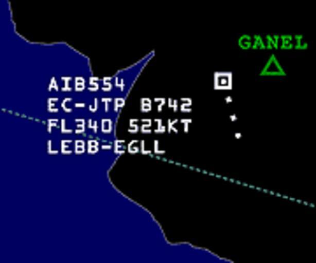 Keywords: ATC radar screen 1.png A piece of a fictional radar screen capture of Air Traffic Control work station <br>We see a coast line an airway or sector border GANEL intersection point and the marker and trail of an airplane The plane transmits transponder signal which contains also the altitude and speed and the work station's computer can construct the full detailed info tag <br>This tag says that flight Air Iberia 554 is realised this time by a Boeing B747-200 which was registered in Spain as EC-JTP its altitude is Flight Level 340 speed 521 knots planned route is from Bilbao to London Heathrow own 2013-11-05 Orion 8 Maps of air traffic control Radar screen displays Cc-zero